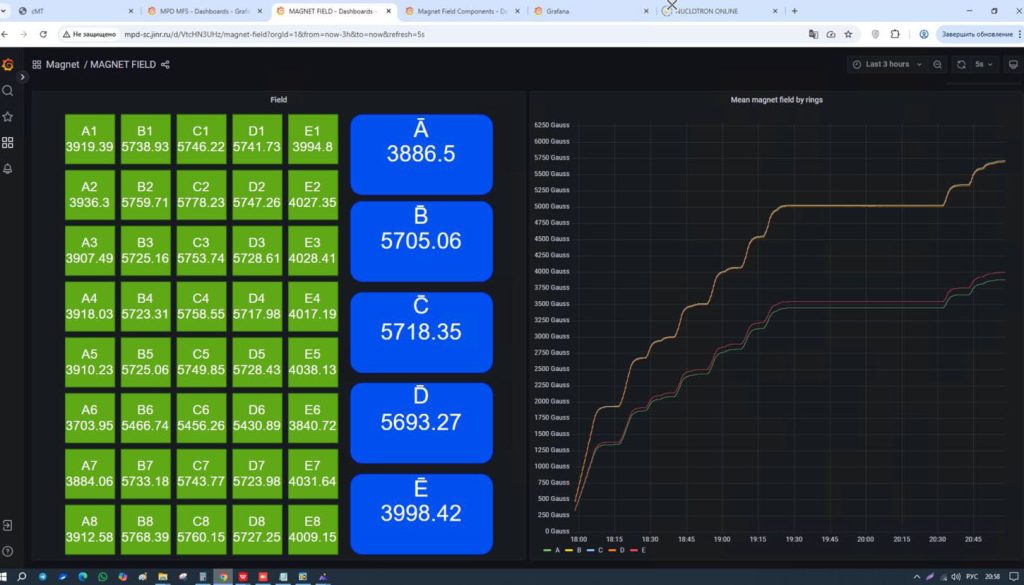 Соленоидальный магнит детектора MPD выведен на проектные параметры поля 0,57 Тл! Все системы работают штатно. Температура стабильна, флуктуаций тока не наблюдается.