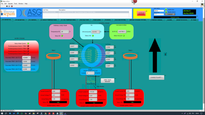 Проектная величина магнитного поля была зафиксировано стационарными датчиками Холла, расположенными на внутренней поверхности соленоида. На картинках показаны данные от датчиков и главный монитор со значением тока: ток 1880 А соответствует 0,5 Тл, а 2140 А — 0,57 Тл.